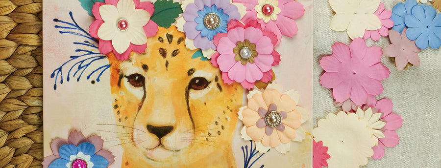 動物のイラストをお花で飾り付けしましょう。留め具にはビジューがついており、完成するときらびやかで立体感のある作品に仕上がります。
