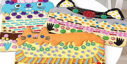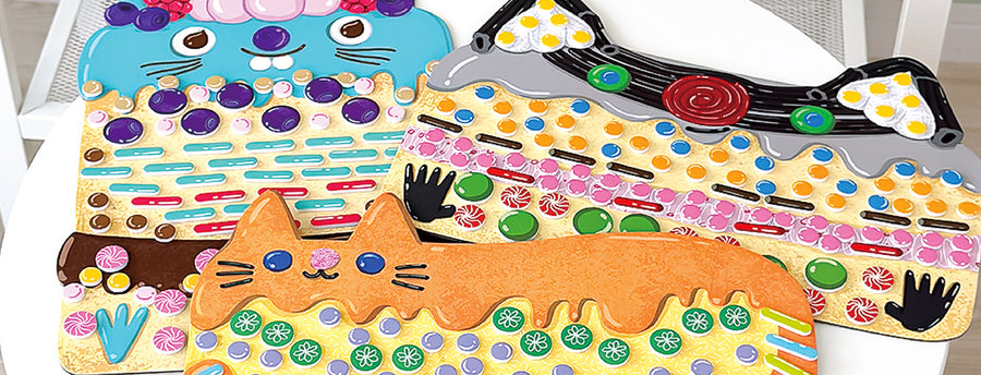キラキラした素材のシールや厚みのあるタイルシールをボードに貼り、立体感のあるかわいいモザイクアートを完成させます。